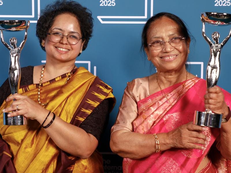 (Photo: Deepa Bhasthi, left, and Banu Mushtaq. Courtesy The Booker Prizes.)