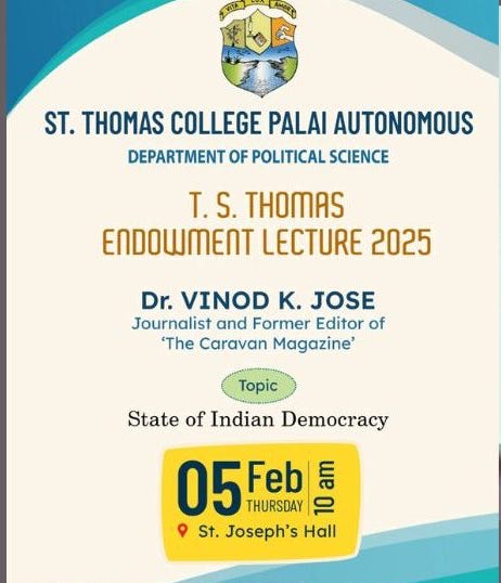 One of the attacks in 2025 was in Kerala, where a man from the RSS attacked “a group of children under 15,” damaging their musical instruments during a Christmas carol performance. So, it is odd that, this week, the St. Thomas College, run by the Catholic Church in Palai, Kerala, cancelled Jose’s lecture on the State of Indian Democracy.