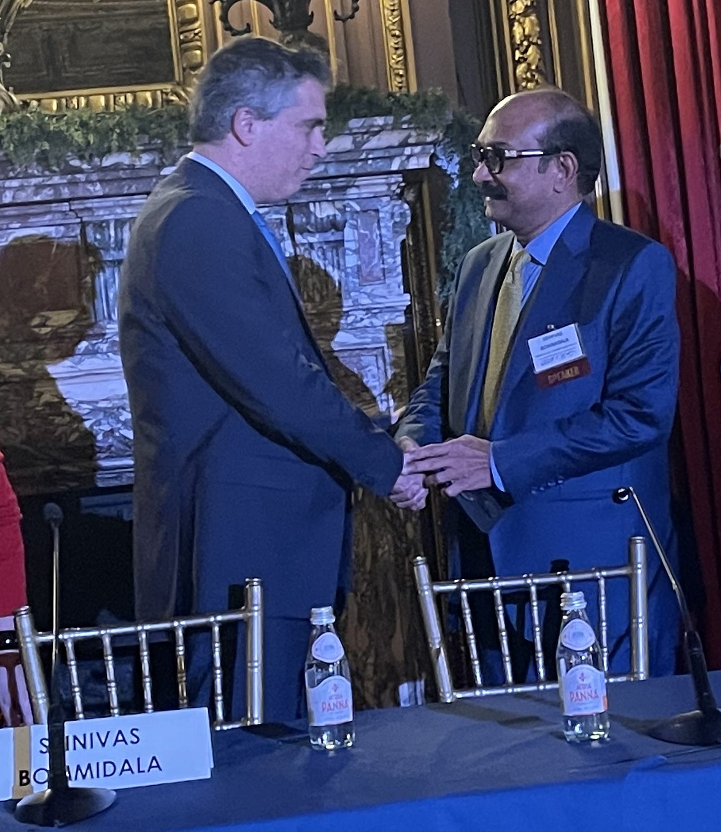 (Photo: Srinivas Bommidala, right, with Christos Dimas, Greece’s Minister of Infrastructure and Transport. © Global Indian Times.)