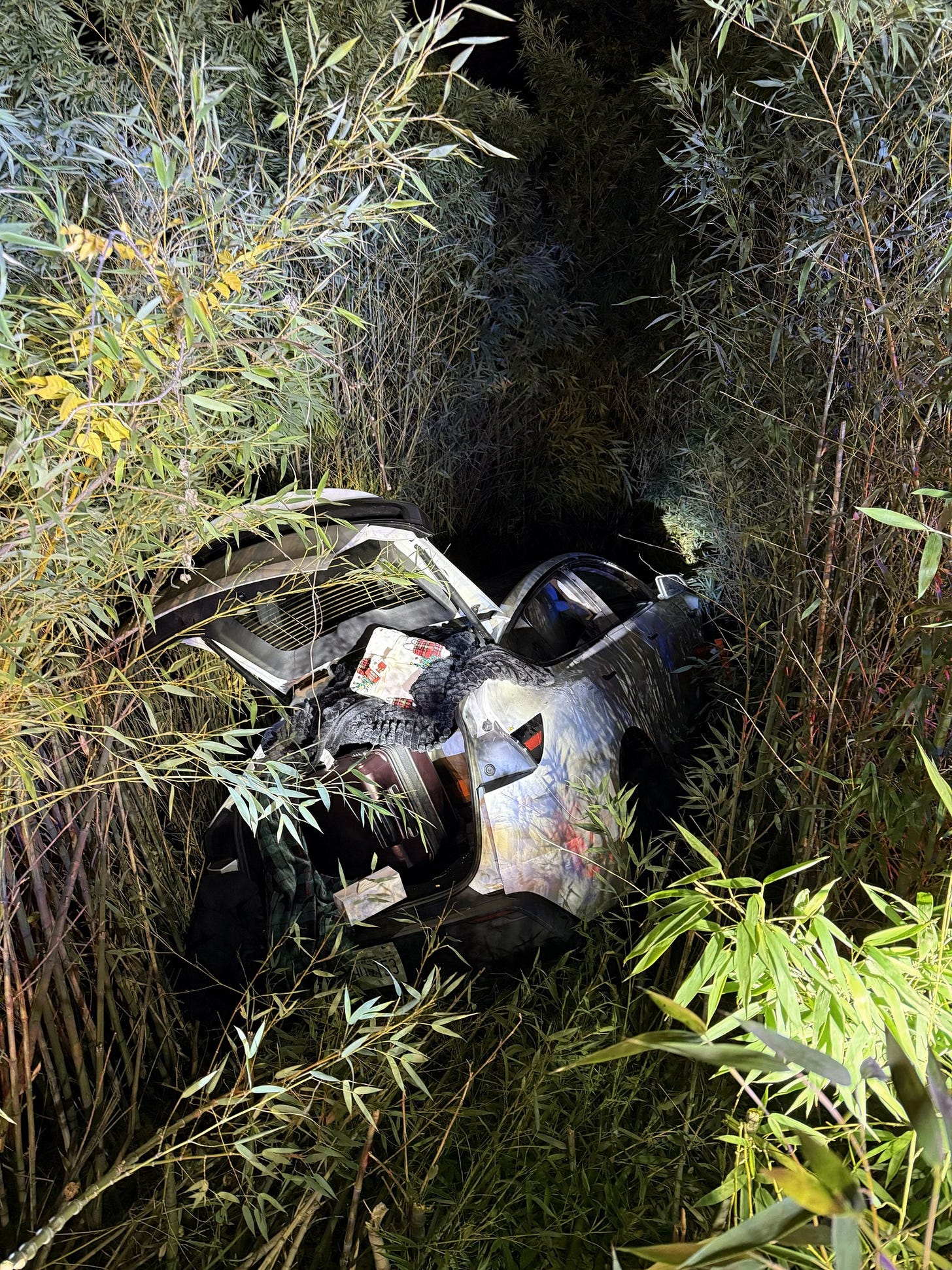 (Photo: Vikram Beri’s crashed Tesla. Courtesy Santa Clara County Sheriff’s Office.)